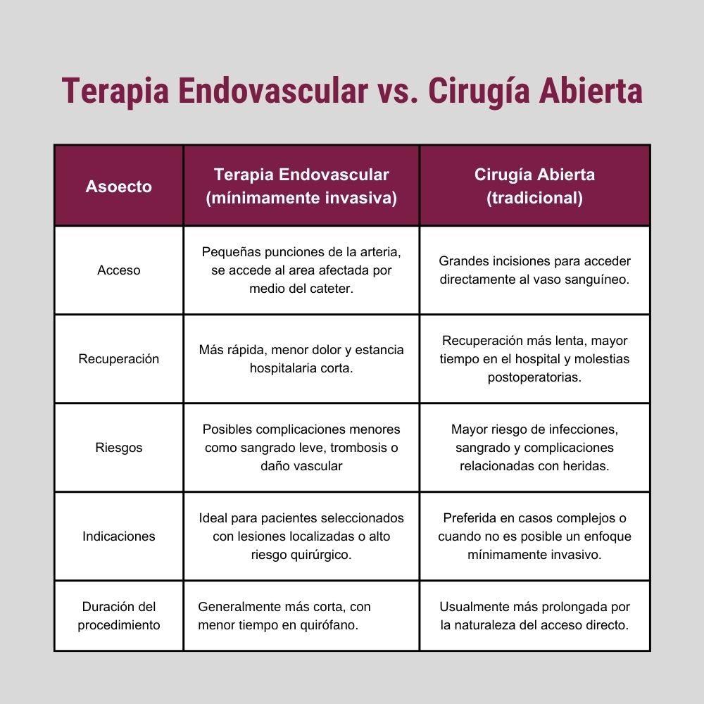 Aunque ofrece muchos beneficios, no siempre es la mejor opción. Tu médico angiologo evaluará tus necesidades específicas para decidir entre un enfoque endovascular o cirugía abierta.
